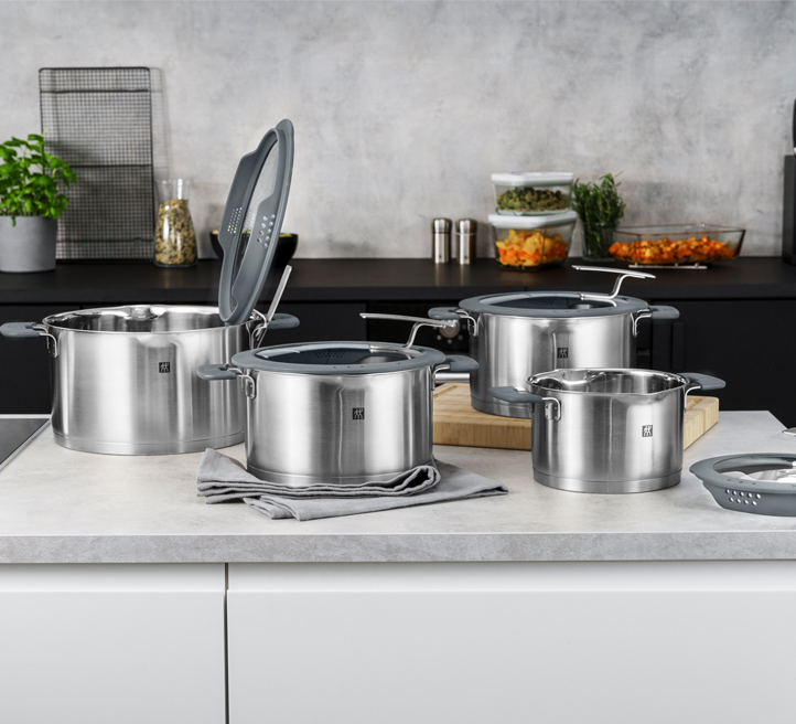 Set di pentole in acciaio inox 18/10 di alta qualità, caratterizzato dal fondo multistrato SIGMA Classic+ per una distribuzione del calore uniforme e impeccabile. Composto da tre pentole e una casseruola, questo set presenta coperchi in vetro innovativi con bordo in silicone e fori integrati di due diverse misure, ideali per scolare i liquidi facilmente senza l'uso del colapasta. Il sistema è studiato nei minimi dettagli: le "X" poste sul bordo indicano la posizione corretta del coperchio per limitare la fuoriuscita del vapore, mentre lo speciale pomolo consente di agganciarlo direttamente alla pentola per mantenere pulito il piano di lavoro. La sicurezza è garantita dalle maniglie con rivestimento soft-touch, che rimangono fredde per una presa sempre confortevole. Tutti i pezzi sono adatti all’induzione e lavabili comodamente in lavastoviglie. Set composto da: 3 pentole Ø16 cm / Ø20 cm / Ø24 cm e 1 casseruola Ø20 cm e relativi coperchi Materiale: acciaio inox 18/10 Lavaggio: lavabili in lavastoviglie