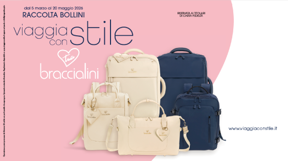 Fino al 20/05/2026 partecipa con la tua carta fedeltà alla collezione firmata Bracciolini, per portare una ventata di stile ad ogni tuo viaggio. Premi entro 07/06/2026